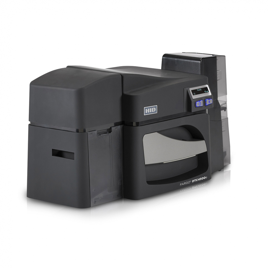 HID Fargo DTC4500e Dual-Sided is a high-performance direct-to-card printer designed for organizations that need fast, reliable, and secure two-sided credential printing at scale. It is a strong fit for medium-to-large businesses, schools, and government agencies that want professional results with minimal downtime. Two standard 100-card input hoppers provide a total capacity of 200 cards, which makes it easy to stage multiple card types and reduce reloads. High-capacity ribbons keep production moving and help you print more full-color cards between consumable changes, which improves overall efficiency. The DTC4500e Dual-Sided prints vivid, edge-to-edge graphics and sharp text at 300 dpi. Use it to deliver brand consistent badges, access cards, and IDs that look polished on the front and back. The dual-sided engine cuts rehandling and helps standardize your card layouts. Protect your issuance workflow with password protection, AES 256 data encryption, and resin scramble data protection. Optional locking hoppers help prevent unauthorized use, while fluorescent panel printing and custom holographic overlaminates add visible and covert security to each card. An internal print server supports secure printing over the network. Add the optional lamination module to boost card durability and security. The module can laminate both sides in a single pass, which increases throughput compared to one side at a time systems. Choose from contact, contactless, and magnetic stripe encoding to integrate smoothly with access control, payment, or membership programs. The DTC4500e supports eco refill ribbons and rewritable cards, which reduces waste and lowers operating costs. Energy efficient operation supports sustainability goals without compromising print quality. The SmartScreen graphical display simplifies setup, ribbon loading, and maintenance. FARGO Workbench with Color Assist helps maintain consistent brand colors across batches and sites. Powerful, secure, and versatile, the HID Fargo DTC4500e Dual-Sided helps you standardize professional two sided credentials, increase throughput, and strengthen card security across your organization.High-volume throughput with dual input hoppers